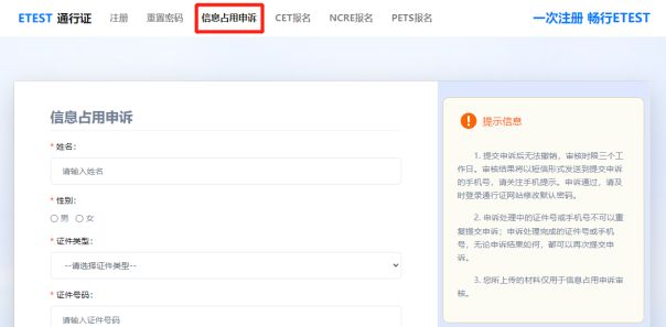 本次报考将继续启用“手机验证码登录报名平台”与“身份证实名验证”双重安全检测功能,如考生安全检测不通过,将无法报名。请考生注册时务必使用本人手机号及身份证,如发现个人信息(身份证号、手机号等)被占用情况,请在注册页面点击“信息占用申诉”(见下图),并按页面指引进行操作。