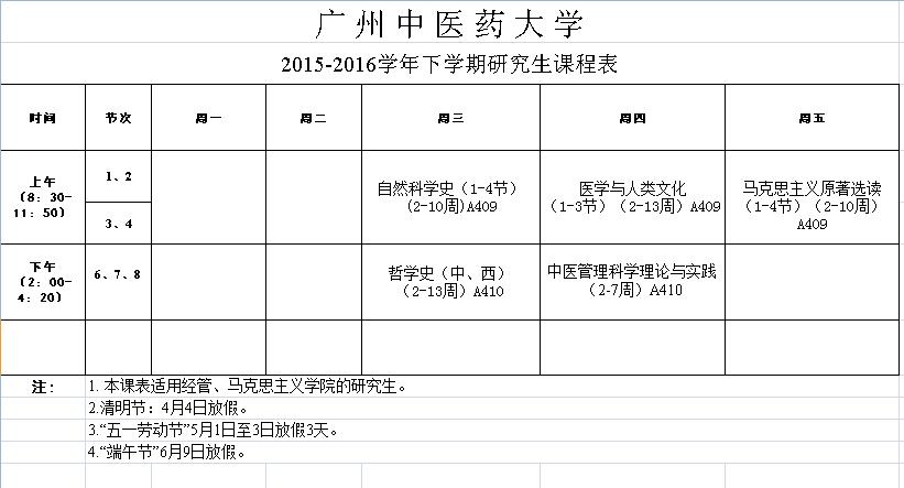 上一条:2016-2017年上学期研究生课表(中医专业硕士) 下一条: 2014-2015学年上学期课程进修班课表(6-19周)